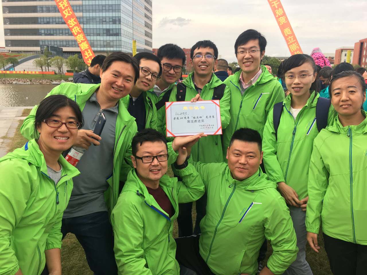在参赛队伍里,生工学院队格外亮眼,清一色的苹果绿上衣,在蓝天白云红叶的衬托下异常醒目,生工队伍一出场,就赢得了大家的阵阵掌声。本届龙舟赛中出现了几个新面孔,最引入瞩目的是王善利老师,虽然年龄是年轻队友的近一倍,但力气一点不比年轻队友差。