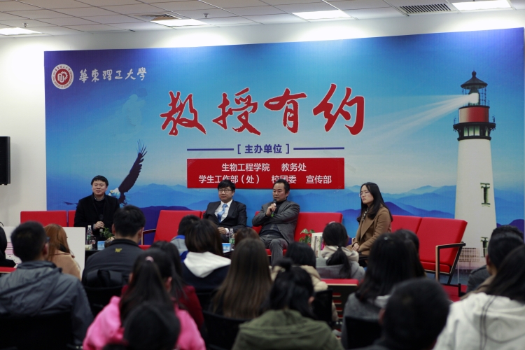 3月14日晚,由校教务处主办、生工学院承办的“教授有约”活动在奉贤校区图文信息中心603室举办,邀请全国优秀科技工作者、国家重点学科——生物化工学科带头人、鲁华生物技术研究所所长魏东芝教授,国家教学名师培育团队成员王玮副教授,以及韩漫