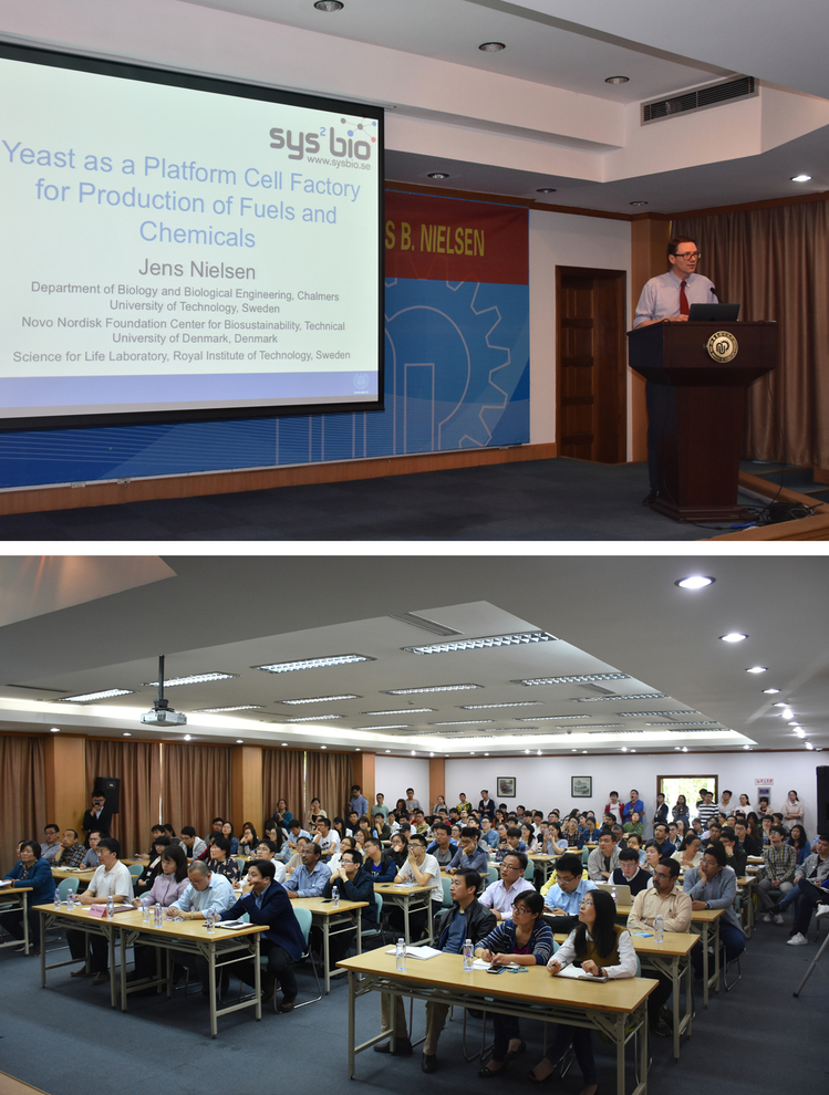 师生作了题为“Yeast as a Platform Cell Factory for Production of Fuels and Chemicals”的学术报告。报告围绕酿酒酵母代谢工程改造,酿酒酵母系统生物学,以及实验室进化等方面,系统介绍了近年来其领导的查尔姆斯理工大学系统生物技术实验室的研究成果,包括次级代谢产物生产、脂肪酸合成、酵母多组学分析平台等。报告后Jens Nielsen院士与韩漫
