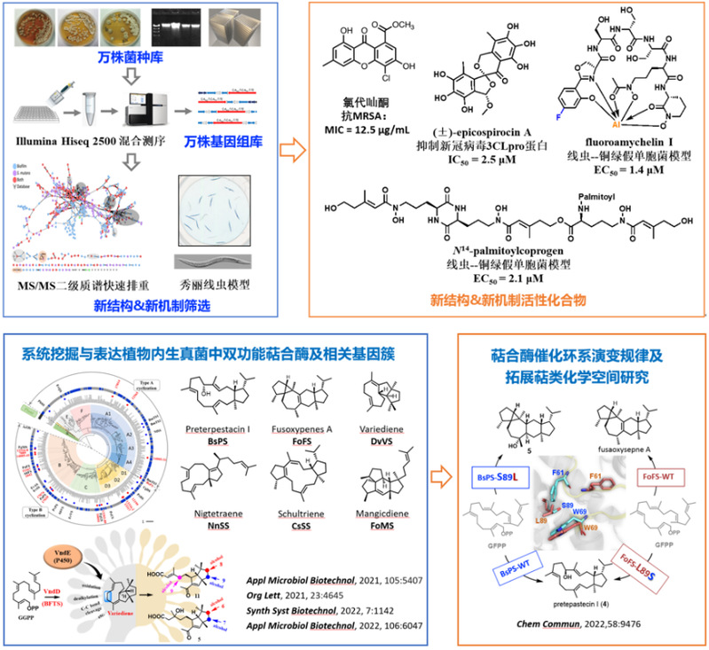 采用基因组生物信息学分析和多种谱学分析手段为导向,快速发现和鉴定微生物来源(包括放线菌和真菌)的新颖活性天然产物。