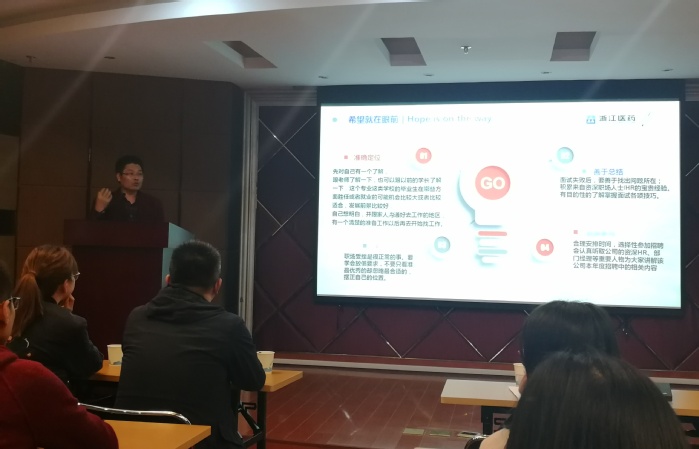 本次活动首先邀请了上海透景生命科技股份有限公司应用工程部总监张晓锋从“我是怎么面试”的角度,为准研究生们分享了在面试过程中需要注意的事项。随后,上海透景生命科技股份有限公司人事部容妍洁总经理以“求职经验分享”为题,从简历书写到面试细节问题等方面为大家做了相关经验分享。最后,浙江医药股份有限公司招聘主任唐仁喜总经理以“职步向前·相约在浙”为题,从秋招和春招的重要性、简历制作技巧和如何应对面试等方面,从企业角度为学生提供了求职参考。活动由韩漫