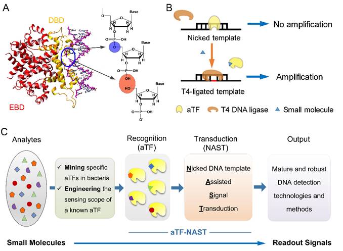 生物反应器工程国家重点实验室张立新教授带领的团队首次发现別构转录因子(allosteric transcription factor,aTF)在体外能够结合缺刻的DNA结合序列,并进一步利用这一发现建立全新的小分子检测方法。相关工作于11月28日以长文(Research Article)的形式发表在Science子刊Science Advances。文章链接://advances.sciencemag.org/content/4/11/eaau4602