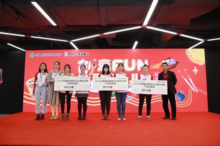 参赛选手沈瑜、连昱涵、潘小旭、刘昱妏的作品“小仙女VS隔壁老王”荣获产品创意奖,吴安迪、王明达、陈怡君、陆丹琳的作品“干!面”荣获创新风尚奖。康师傅集团上海地区董事长杨乾辉先生、康师傅集团副总裁王世琦先生及中国食品科学技术学会副理事长金征宇、中国食品科学技术学会名誉副理事长潘迎捷教授等出席大赛并给获奖选手颁奖。