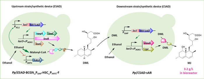基于合成生物学技术,利用酵母底盘细胞异源合成高附加值药物分子(如聚酮、萜类、黄酮、生物碱等)已成为全球的研究热点并展现巨大的应用潜力,但酵母细胞中药物合成前体乙酰辅酶A的分区分布及含量不足常使目标产物合成能力受限。该研究发现了甲基营养型毕赤酵母(Komagataella phaffii)具有强力的乙醇同化能力,这与常规酵母易通过葡萄糖效应生产积累乙醇极为不同。而乙醇在细胞质中经三步代谢直接产生乙酰辅酶A,将利于其衍生药物分子的合成。基于此,作者设计了乙醇诱导型(ESAD)及组成型(CSAD)转录调控信号放大器件,使乙醇诱导表达能力提升近20倍,并实现了葡萄糖阻遏/乙醇诱导的理想调控模式。将此器件用于合成降血脂药物辛伐他汀中间体莫纳克林J,以ESAD驱动上游合成途径,CSAD驱动下游合成途径,并偶联莫纳克林J竞争途径的阻断调控,最终实现酵母菌群反应器发酵生产莫纳克林J高达3.2g/L,且无副产物累积,具备工业应用前景。辛伐他汀全球年销售额近30亿美元,其工业半合成中间体莫纳克林J主要通过土曲霉发酵生产洛伐他汀,再经高温、强碱水解而得。该研究为莫纳克林J的工业生产提供了新模式,有望降低生产及环保成本。