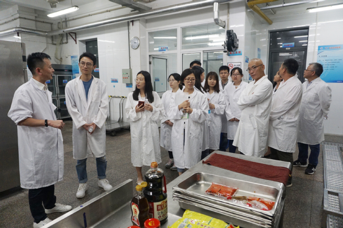 硕士联合支部同学在饮食服务中心副主任曹建方的指引下有序参观了食堂后厨,深入了解食堂“6T实务”和餐饮制度,在学校的后厨卫生、制度规范、功能设置和设备使用等方面一一听取了对方的介绍,由此对学校的餐饮工作有了更新、更全面的认识。