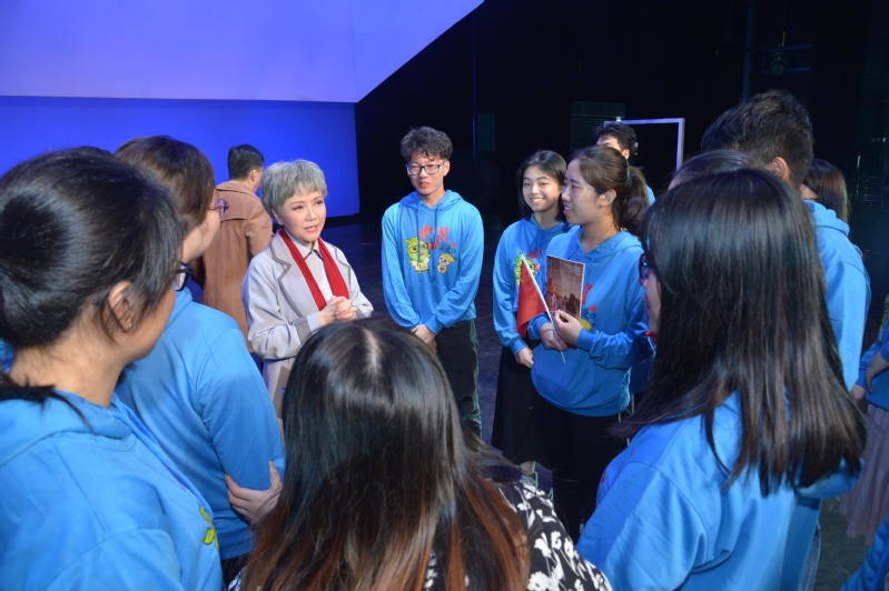 师生亲切交流,上海沪剧院院长茅善玉(樊锦诗饰演者)表示非常高兴这么多年轻人来观看《敦煌女儿》,希望能够把剧中的“敦煌精神”传递给青年一代。国家一级演员钱思剑(彭金章饰演者)讲述了故事原型扮演者的生平事迹和他为了妻子事业背后的默默支持,并对青年一代继续投身祖国建设寄予厚望。现场观剧的靳子扬同学表示《敦煌女儿》对他不仅是视听盛宴,更是精神传承,深深被坚守敦煌数十年的先辈的精神打动。作为新时代青年学子,要学习前辈们吃苦肯干、踏踏实实的精神,多做实事,多做贡献。