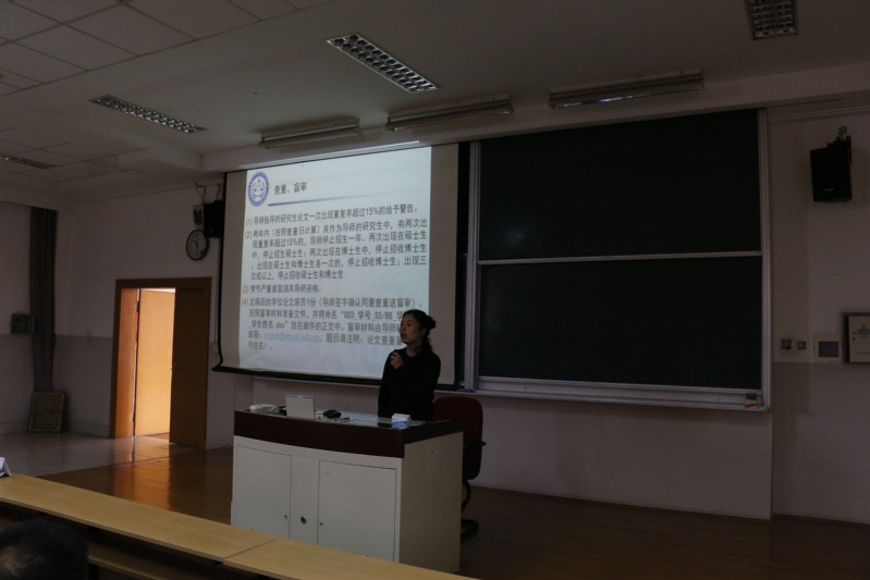 周静老师向大家介绍了毕业及学位申请等相关信息。周老师从论文查重、盲审、答辩等方面向大家介绍了毕业及学位申请的流程、要求,并就学位申请资格、文章发表与接受截至时间等方面回答了大家的问题。