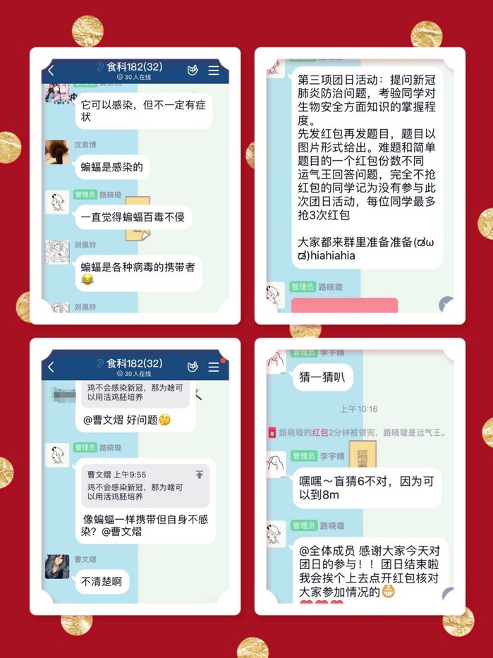 开展“五四薪火”系列云活动,通过战“疫”青年讲师团专题讲座、团徽挑战接力赛、主题团日等形式传承五四精神,增强生工学子的责任感和使命感。