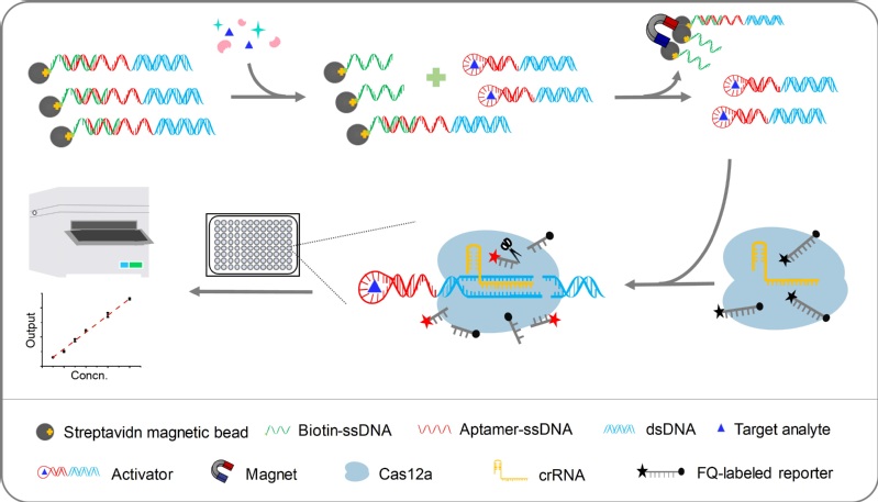 生物反应器工程国家重点实验室(以下简称国重室)张立新教授团队及其合作者利用CRISPR-Cas12a技术建立了针对小分子化合物的简单快速、灵敏、高通量和低成本检测平台,简称CaT-Smelor猫嗅技术(Nat Commu, 2019, 10: 3672)。为进一步扩展其通用性,该研究耦合CRISPR-Cas12a与核酸适配体,开发了升级版第二代检测平台CaT-Smelor 2.0,大幅扩展了底物检测类型,还可实现蛋白质等多种检测物的传感与高效检测。相关研究论文“A versatile biosensing platform coupling CRISPR–Cas12a and aptamers for detection of diverse analytes”于9月6日在Science Bulletin期刊在线发表(链接: //doi.org/10.1016/j.scib.2020.09.004)。