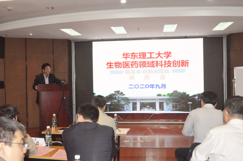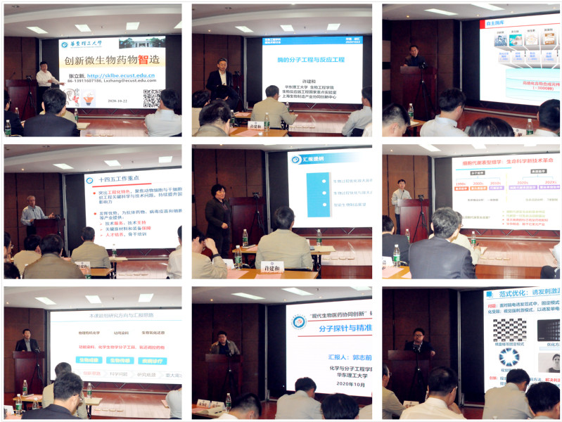 生工学院教授张立新、许建和、魏东芝、谭文松、庄英萍分别从创新微生物药物制造、酶的分子工程与过程工程研究、定制酶与细胞工厂促进绿色生物制造、动物细胞培养在生物医药领域的应用、生物过程优化放大理论与实践五个方面做了专题汇报。药学院教授杨弋、杨有军针对细胞代谢分析与调控技术、面向生物医药的染料分子工程研究进行了汇报。化分学院教授郭志前从分子探针与精准诊疗方面、信息学院教授金晶从基于脑机接口的康复技术及其应用方面进行了汇报。