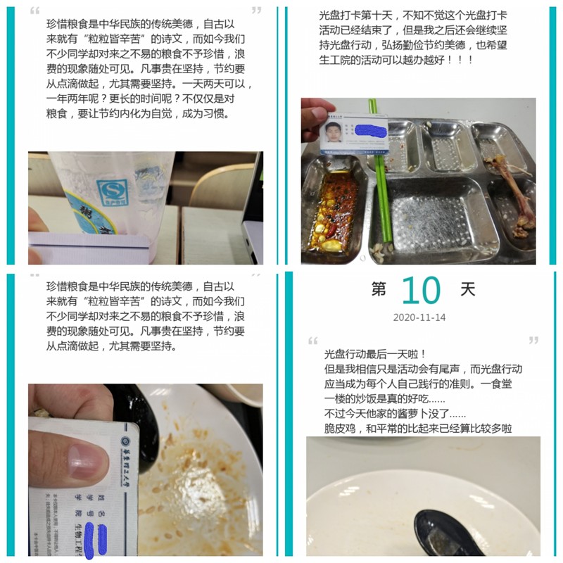 于11月5日至11月14日举行为期十天的光盘打卡行动。本次活动中,同学们踊跃参加,分享品尝美食的快乐以及光盘行动中的心路历程。