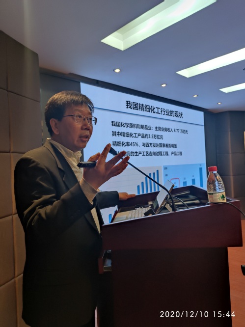 ,钱旭红院士首先谈起了曾经的往事。在一张孔雀的国画背景下,他分享了自己大学时代成立书画协会并担任第一任会长的趣事,引起会场笑声一片。随后钱院士开始了一场生动形象的学术报告。报告中钱院士从我国精细化工行业现状开始,阐述了我国化工行业普遍存在的研发和生产水平低、安全风险高、装备技术落后等问题,指出精细化工行业迫切需要转型升级来突破困境,而关键是需要突破性和颠覆性的超限制造技术——微流控技术和微通道反应器的集成。