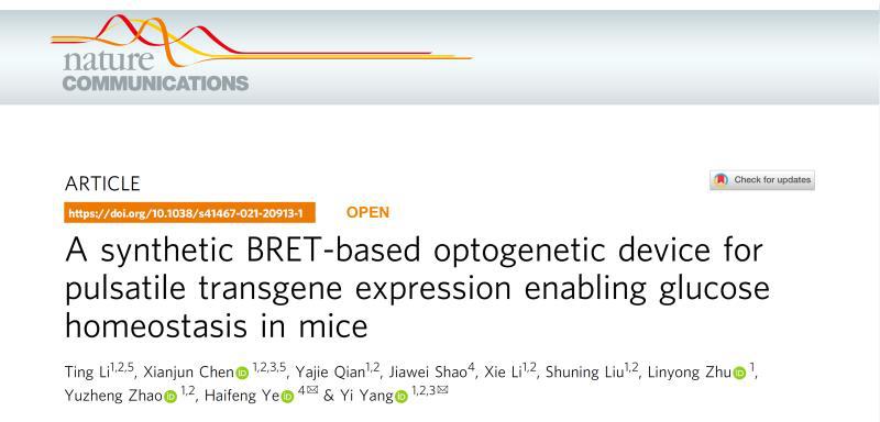 生物反应器工程国家重点实验室和光遗传学与合成生物学交叉学科研究中心杨弋教授团队在国际权威学术期刊Nature Communications发表题为“A synthetic BRET-based optogenetic device for pulsatile transgene expression enabling glucose homeostasis in mice”的研究论文,报道一种新型基因表达调控技术,可脉冲式激活哺乳动物细胞和小鼠体内的基因表达。