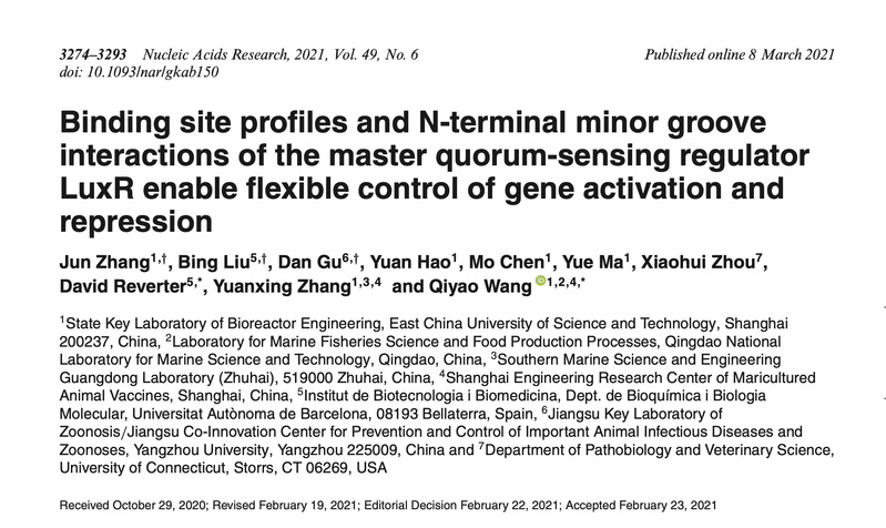 人与人之间可以通过语言、表情和动作进行交流。细菌菌体之间也能进行互相交流通讯,实现细菌的“社会性”行为,实现它们的共同目标,包括生物被膜、生物发光、运动性、营养代谢、毒力调节和环境适应性等。这种菌群交流通讯的机制称为群体感应 (Quorum sensing, QS) 系统。在海洋弧菌中存在复杂的群体感应系统,介导进行细菌种内和种间、细菌-藻类、细菌-动物宿主等多种信号交流机制,最终通过TetR家族的中枢调控元件LuxR蛋白同步控制下游多达600多个QS基因的表达,产生菌群行为。人们对LuxR蛋白同时调控诸多基因表达的机制一直不清楚。4月6日,国际知名的生化与分子生物学学术期刊Nucleic Acids Research发表了韩漫