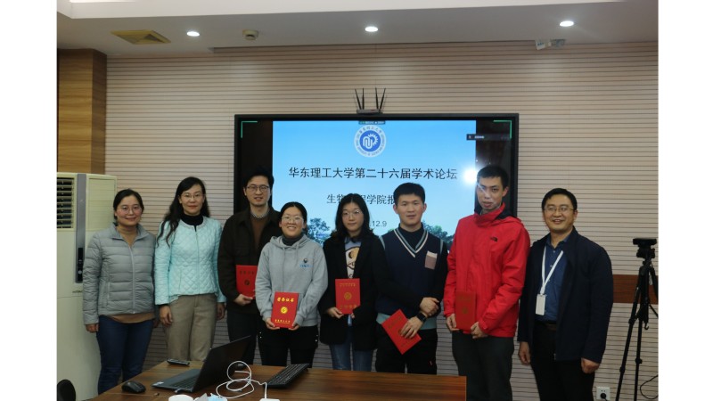 答辩选手充分展示了生工研究生严谨的科研态度和扎实的专业知识,赢得了现场评委和线上观众的肯定。在各位选手精彩汇报后,评委老师对选手进行提问,并对其研究成果的分析应用给出宝贵的专业性指导。最终,王钰莹同学荣获一等奖,徐峰同学荣获二等奖,李妮同学荣获三等奖,余君雄、李华栋同学获得优胜奖,评委老师为获奖者颁奖并合影留念。