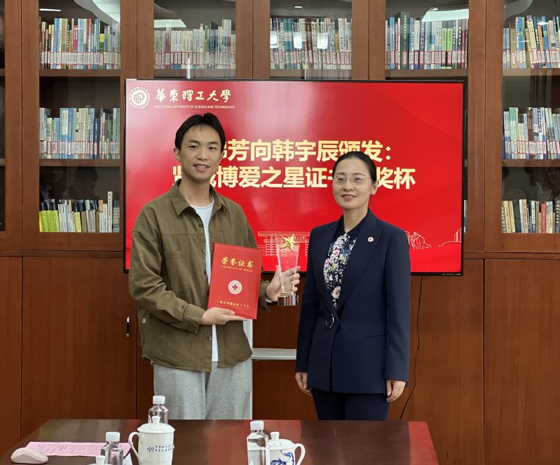 随后,副区长、区红十字会会长张娣芳为韩宇辰颁发了奉贤区“贤城博爱之星”证书、奖杯。区红十字会党组书记、常务副会长沈俭英为韩宇辰送上慰问信和鲜花。校团委副书记魏星(主持工作)为韩宇辰颁发慰问奖励,送上慰问纪念品。