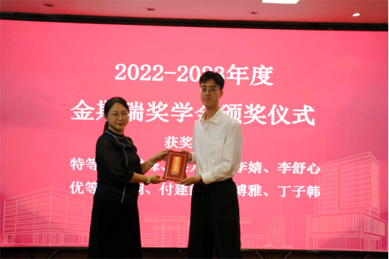 随后进行了2022年度金斯瑞奖学金颁奖仪式,梁艳为获奖学生代表丁子韩颁发个人荣誉证书,获奖学生表达了对金斯瑞生物科技有限公司的感谢。