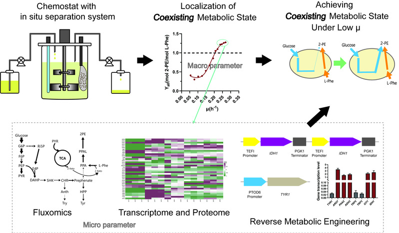 作者在前期调研中注意到,少数文献曾偶然报道批式发酵的转化率略微超过理论值,推测冗余部分可能来自于从头合成途径,但具体的出现条件和机制未被明确阐明。因此,本研究基于原位分离系统的恒化培养平台,系统探索了艾氏途径与从头合成途径协同运作(“并存”代谢状态)的具体条件。结果表明,“并存”代谢状态在较高比生长速率下出现,且该阈值超过了工业生产中为避免乙醇生成所需控制的临界比生长速率(Crabtree效应出现阈值)。为实现实际应用,研究者通过基于酶约束全基因组代谢网络模型的通量分析,揭示低比生长速率下难以出现“并存”代谢的关键因素:(1)NADH供应不足,限制了L-Phe向2-PE的完全转化;(2)L-酪氨酸途径存在强烈的分流效应。结合相关酶的转录与蛋白水平分析,确定了调控“并存”状态的关键位点。通过敲弱L-酪氨酸合成第一步关键酶TYR1,并过表达线粒体异柠檬酸脱氢酶亚基IDH1以提高胞内NADH供应,成功在临界比生长速率下实现了显著的“并存”代谢状态。在实际的补料分批发酵过程中,该工程菌株的快速合成期转化率提升了33.2%,最终产量达到12.1 g/L,位居酿酒酵母β-苯乙醇生产的领先水平。该研究不仅为突破β-苯乙醇绿色合成过程中的效率瓶颈提供了新思路,也为多途径协同合成机制研究奠定了理论基础,具有重要的产业化应用价值。