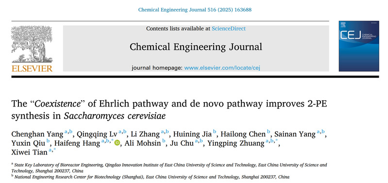 生物反应器工程全国重点实验室庄英萍团队在β-苯乙醇高效生物制造方向取得的创新研究成果,论文题目为 “The ‘Coexistence’ of Ehrlich Pathway and de novo Pathway Improves 2-PE Synthesis in Saccharomyces cerevisiae”。该研究首次提出打破 β-苯乙醇理论转化率上限的新策略,为推动其绿色生物合成向产业化应用迈进提供了重要理论依据与技术指导。