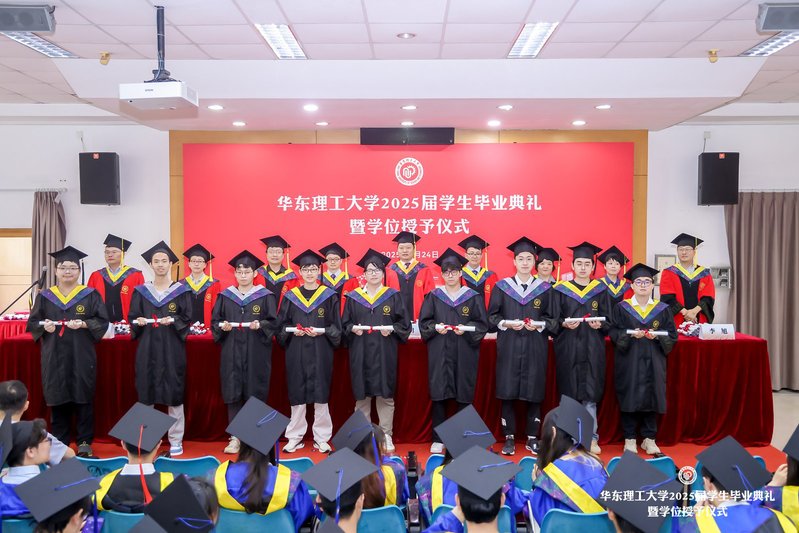 院长叶邦策,国家生化工程技术研究中心(上海)主任庄英萍,学院副院长、生物反应器工程全国重点实验室主任张立新,校科学技术发展研究院副院长刘琴,校研究生院副院长郁惠蕾,学院党委副书记李旭,学院副院长郑高伟,学位委员会委员,研究生导师代表,班导师,辅导员,教务员参加典礼。师生家长齐聚一堂,共同见证2025届毕业生开启人生新篇章的重要时刻。毕业典礼由学院党委副书记孟庆鹏主持。