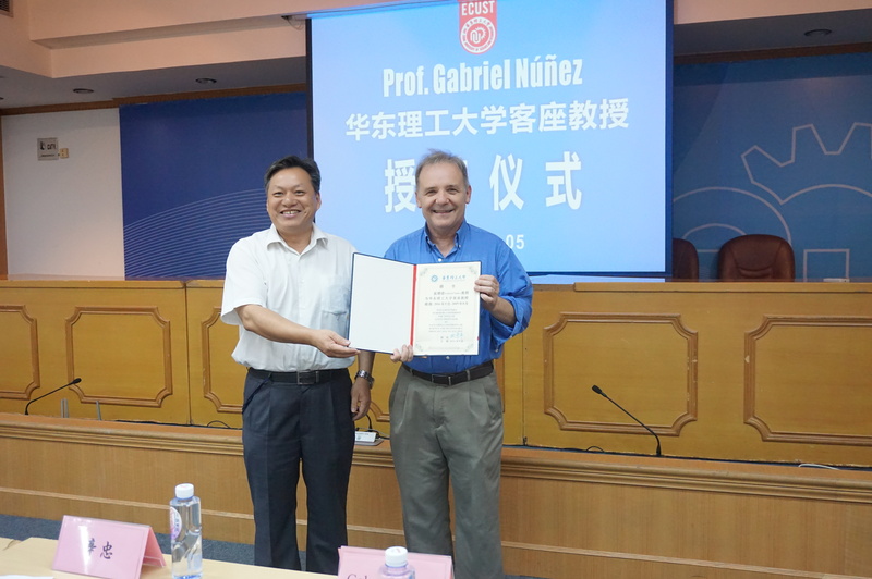 9月5日,密歇根大学Gabriel Nunez教授受聘我校客座教授仪式在逸夫楼演讲厅举行。副校长辛忠代表学校致辞并为Nunez教授颁发聘书、佩戴校徽。