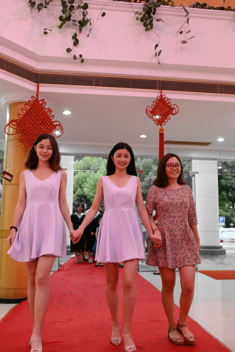 毕业盛典在“传统项目”——红毯仪式中开启。男生西装革履,女生礼服加身,一位位身着华服的“明星”或与伴侣携手、或与同学相伴,亦与家长、老师相携,优雅迈步,颇有几分电影节明星走红毯的味道,引得场馆内阵阵欢呼。