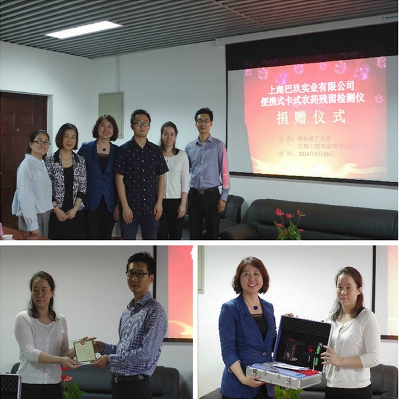 5月26日下午,上海巴玖实业有限公司便携式卡式农药残留检测仪捐赠仪式,在奉贤校区实验七楼613室举行。上海巴玖实业有限公司经理张鹏、李翠平,上海市慈善基金会募捐部副部长陈晓菲、处置部副部长陆双龙,我校勤工助学指导中心李波老师,生物工程实验教学中心常务副主任常雅宁以及相关人员出席了捐赠仪式。