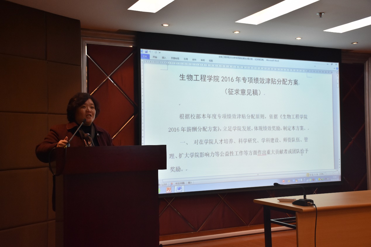 2016年11月29日,学院在实验18楼召开学院教代会代表会议,通报并讨论《生物工程学院2016年专项绩效津贴分配方案》(征求意见稿)(以下简称《专项津贴分配方案》)。30多位代表到场,工会主席蔡海波主持会议,学院党委书记陆兵、院长庄英萍到场并解释《专项津贴分配方案》。
