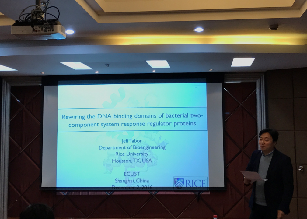 2016年12月2日,美国莱斯大学生物工程系助理教授Jeffrey J. Tabor博士应我院吴辉副教授邀请访问生物工程学院与生物反应器工程国家重点实验室,并作题为“Rewiring the DNA binding domains of bacterial two-component system response regulator proteins”的精彩学术报告,生物工程学院全舒教授等教师和同学参加了本次学术报告会,报告会由吴辉副教授主持。