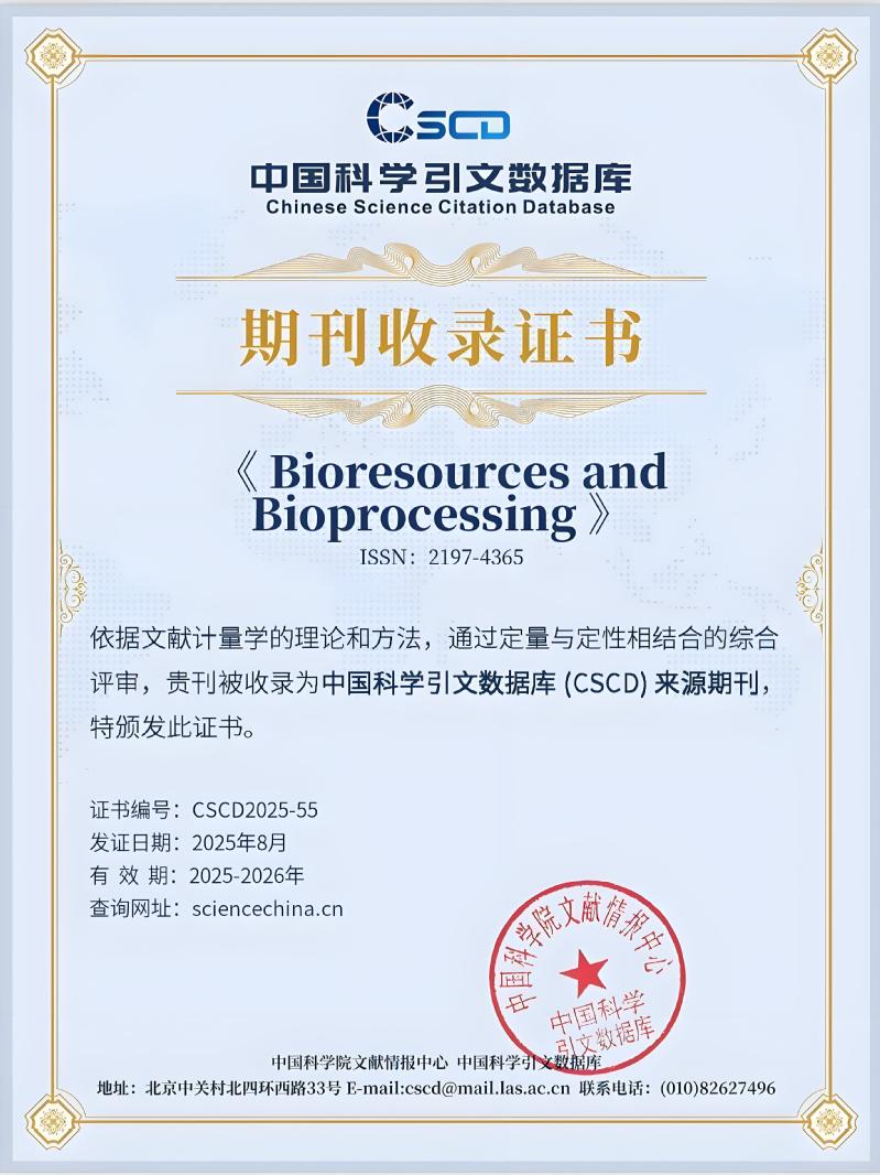 附:Bioresources and Bioprocessing 是由华东理工大学生物反应器工程全国重点实验室与Springer Nature合作出版的英文学术期刊,ISSN为2197-4365,全面实行开放获取。目前已被SCIE、ESCI、EI、PubMed Central、DOAJ、Scopus、PMC、CSCD等重要数据库收录。2024年最新影响因子稳步提升至5.1,学科排名25/177,位列JCR Q1区,CiteScore达9.5。2024年入选中国科技期刊卓越行动计划二期入选项目,2025年荣获Springer Nature“服务影响力奖”。官网地址为//www.bioresourcesbioprocessing.com。