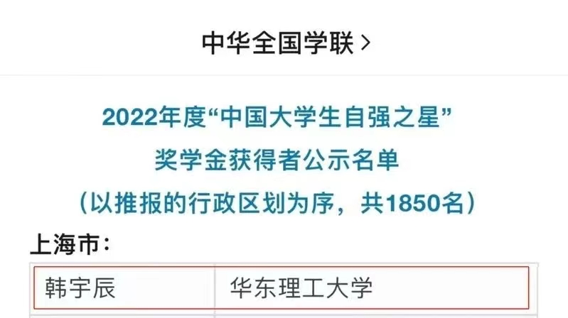 近日,由共青团中央、全国学联指导,中国青年报社、新东方教育科技集团、中国青年创业就业基金会联合举办的2022年度中国大学生自强之星奖学金获得者名单公示。经学校推荐、省级初评、全国评审等环节,我院2022级硕士研究生韩宇辰入选,荣获中国大学生自强之星奖学金。